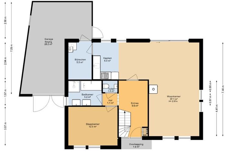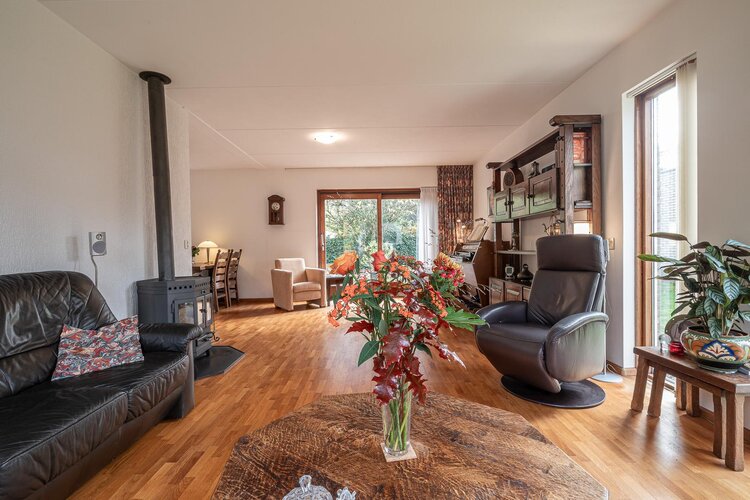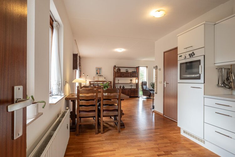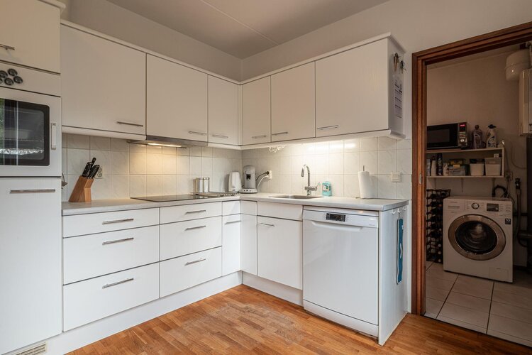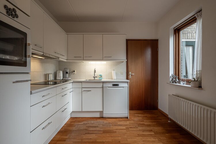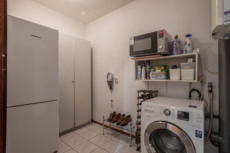 Aansluitend aan de keuken tref je de bijkeuken, deze bijkeuken is ideaal voor het opstellen van de wasmachine en droger. De CV vind je er aan de wand en via deze bijkeuken is ook de L-vormige garage bereikbaar.