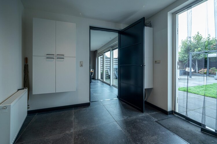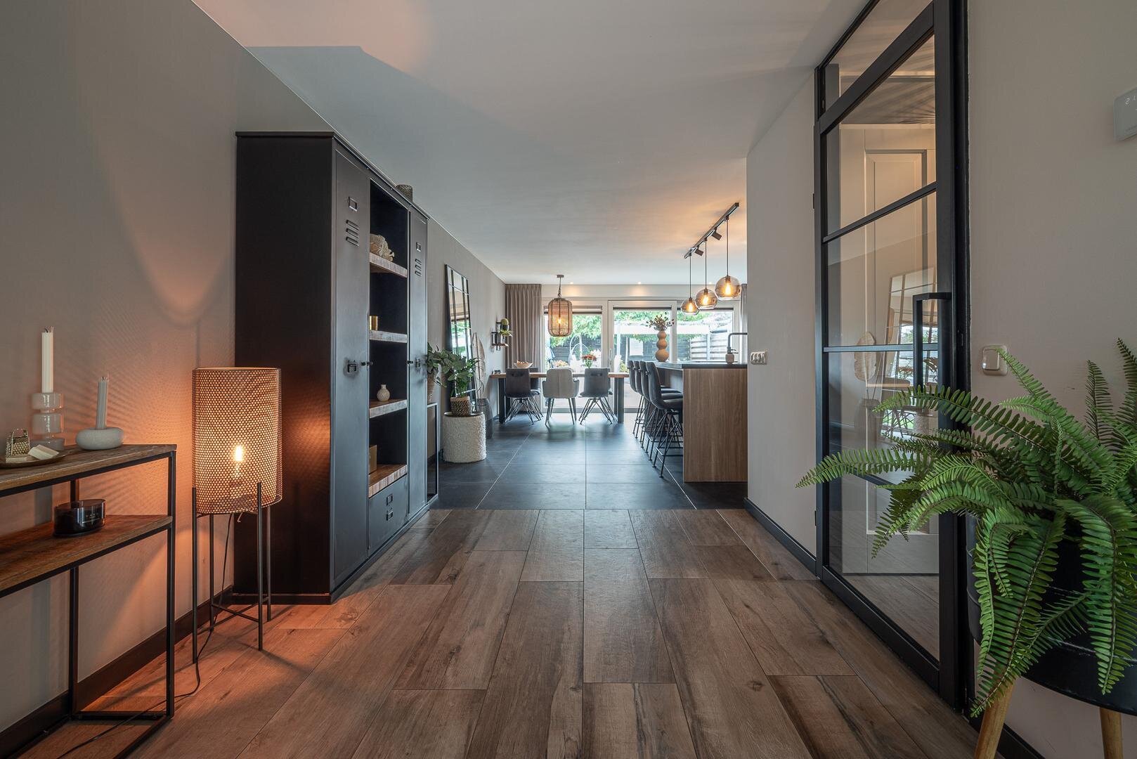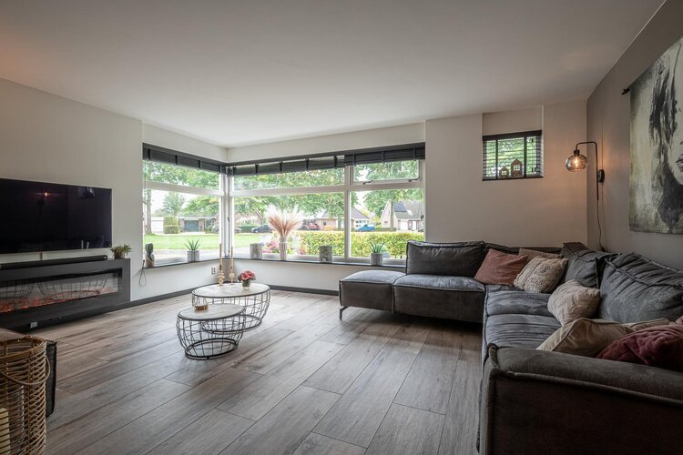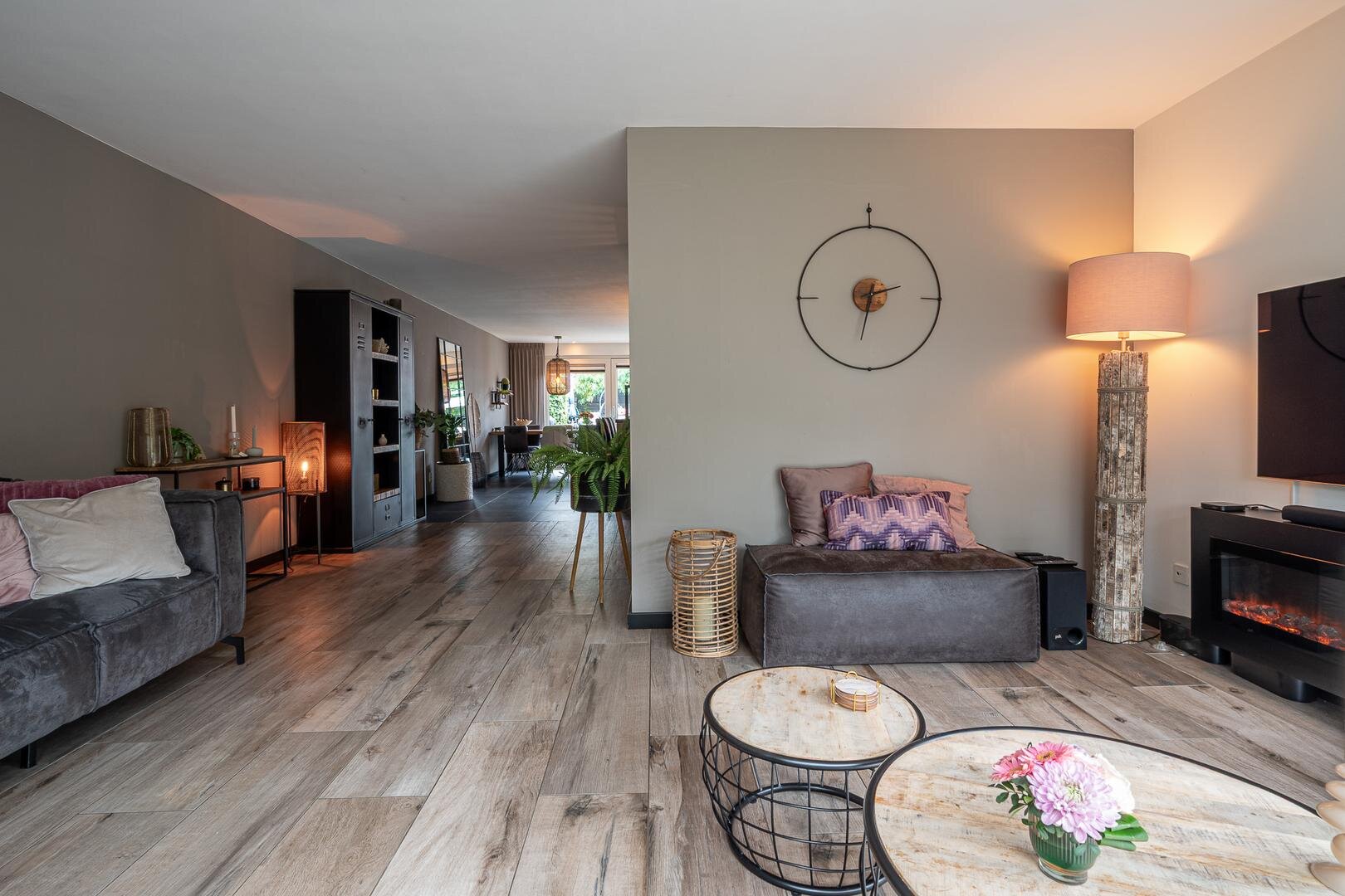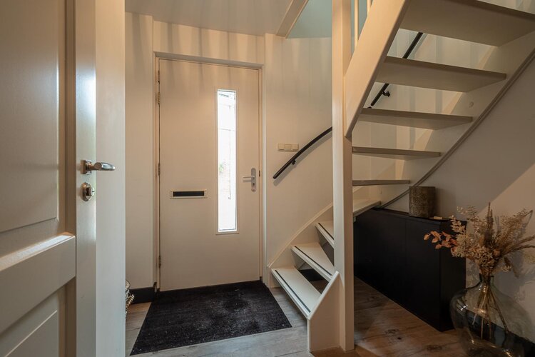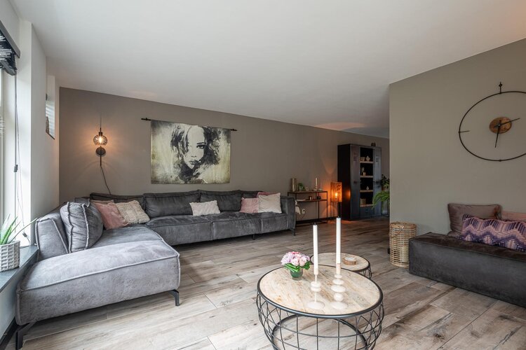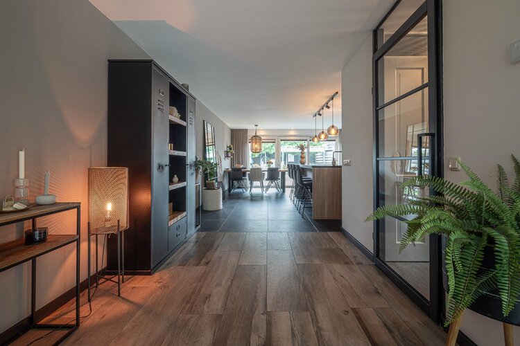 Hal/entree met toilet (hangcloset met fonteintje), meterkast en garderobe. Via de stijlvolle taatsdeur kom je in de royale woonkamer met aan de achterzijde de in 2020 uitgebouwde woonkeuken met schuifpui naar de tuin. De woonkamer heeft een gezellige elektrische haard en een keramische tegelvloer met vloerverwarming.