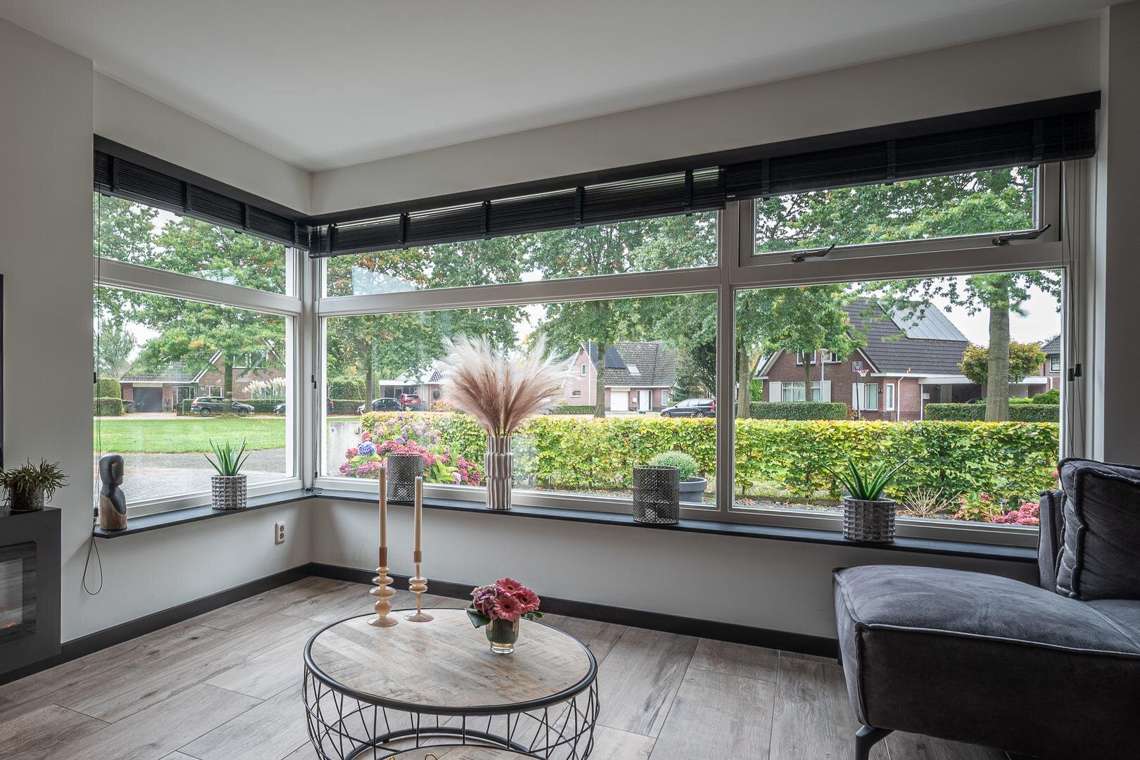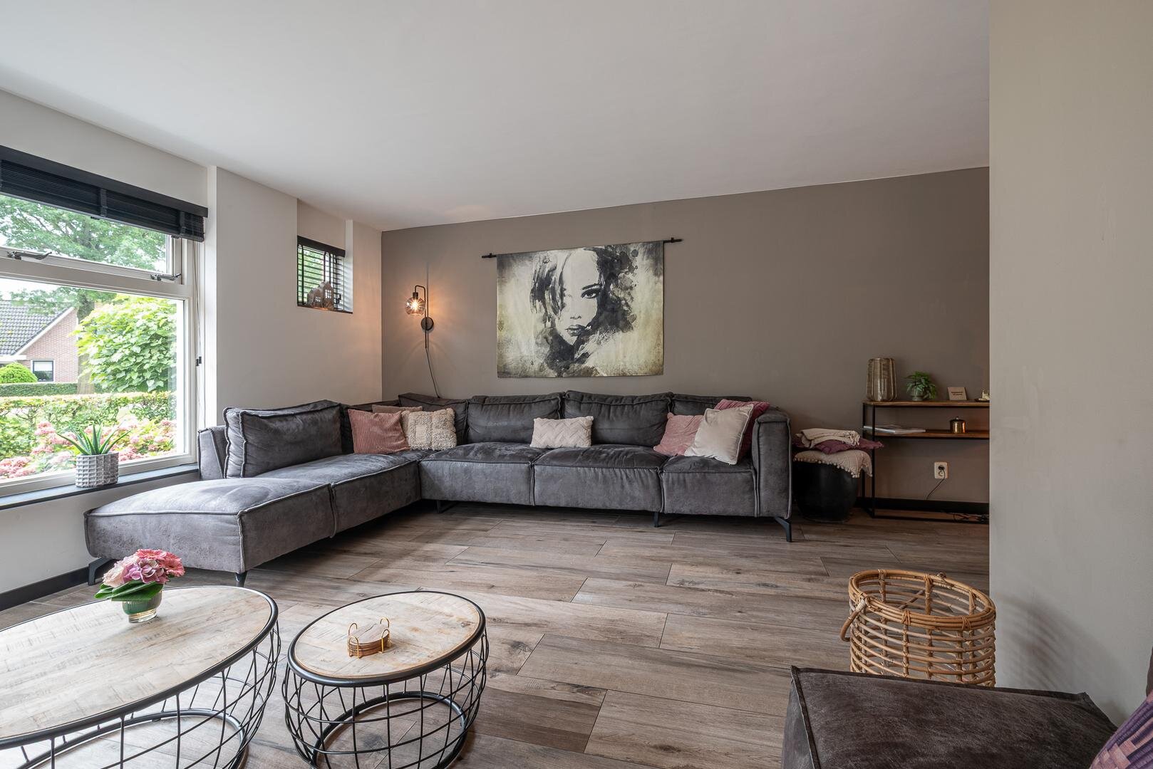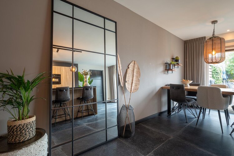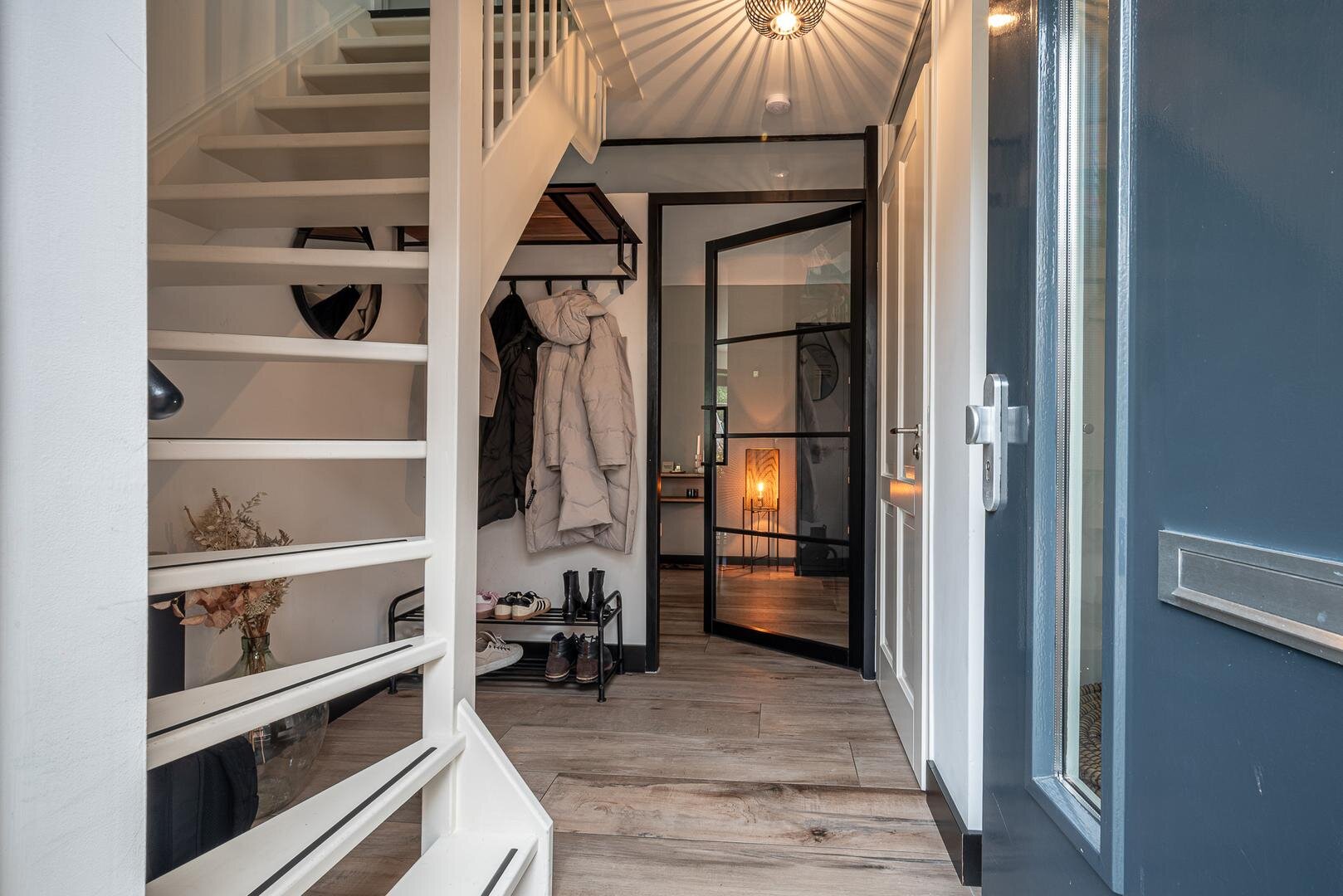 Hal/entree met toilet (hangcloset met fonteintje), meterkast en garderobe. Via de stijlvolle taatsdeur kom je in de royale woonkamer met aan de achterzijde de in 2020 uitgebouwde woonkeuken met schuifpui naar de tuin. De woonkamer heeft een gezellige elektrische haard en een keramische tegelvloer met vloerverwarming.