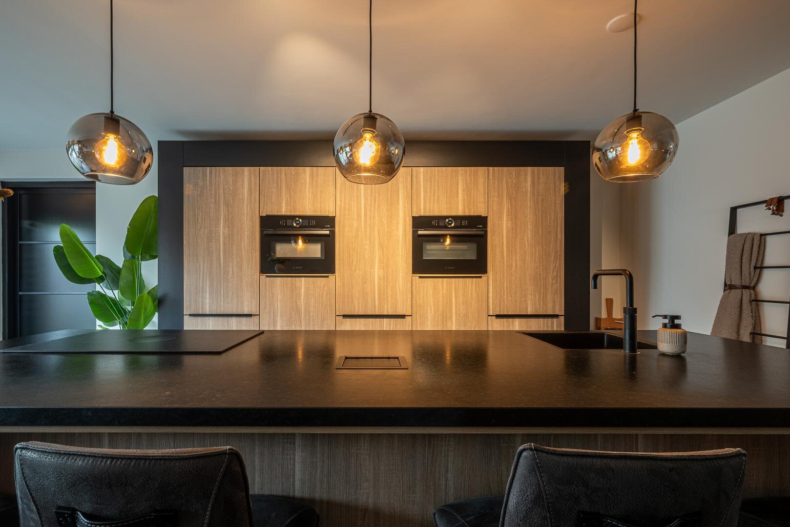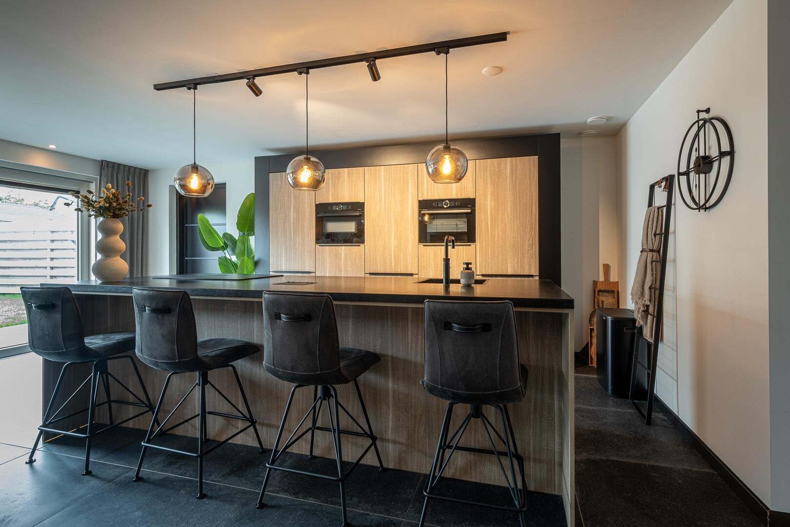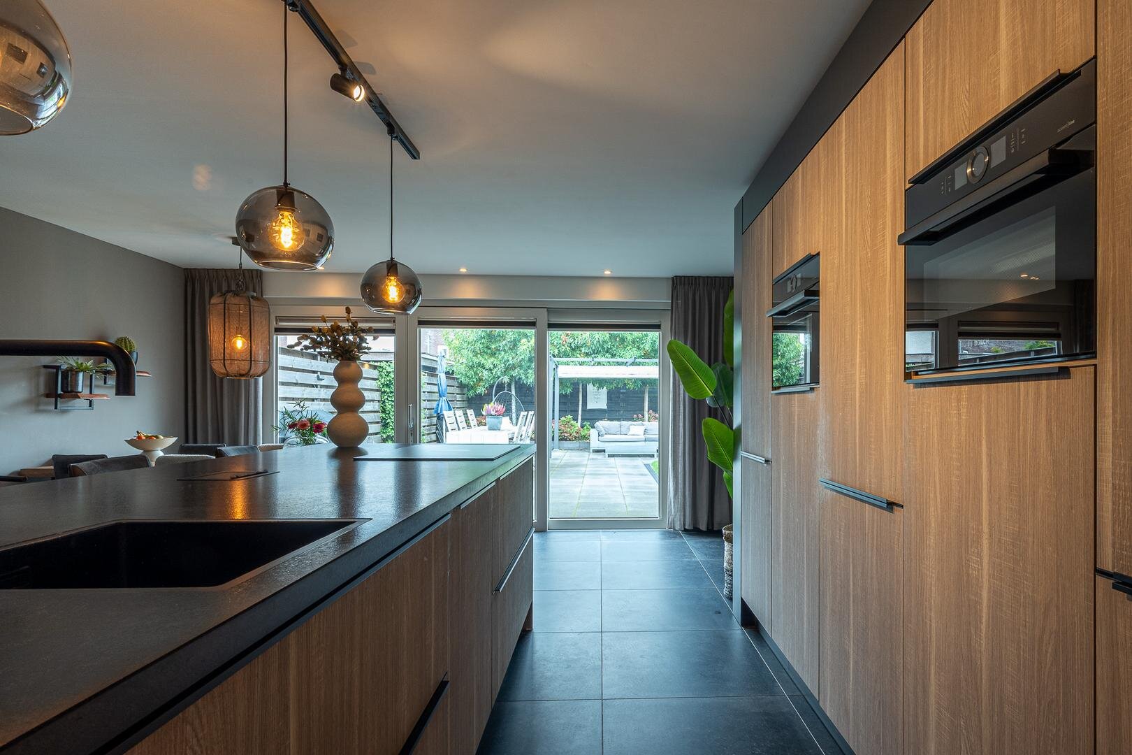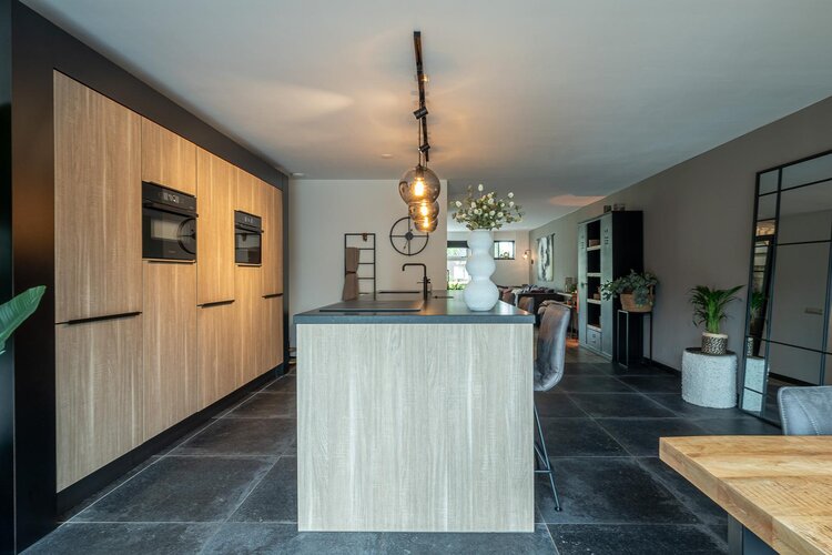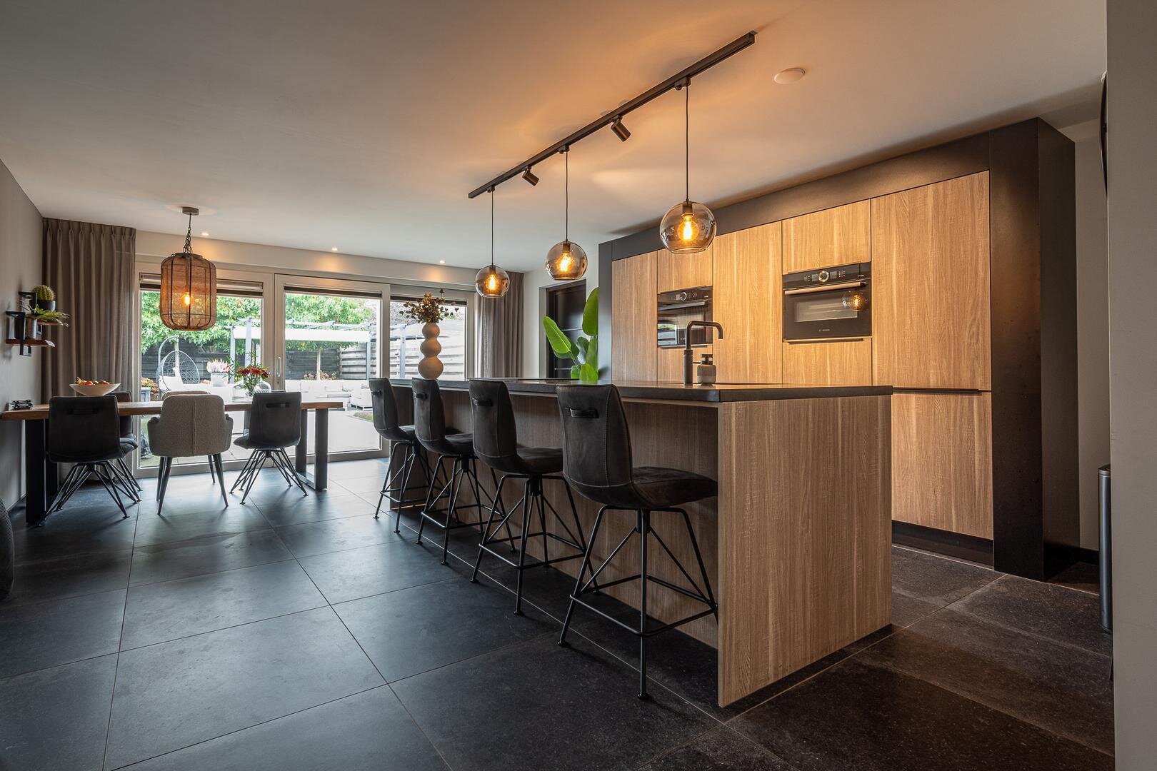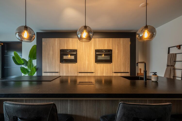 De moderne keuken is voorzien van een kookeiland en diverse inbouwapparatuur, waaronder een quooker, vaatwasser, stoomoven, combimagnetron/oven en inductiekookplaat met geïntegreerd afzuigsysteem en een mooie kastenwand. Vanuit de bijkeuken heb je toegang tot zowel de tuin als de garage.
