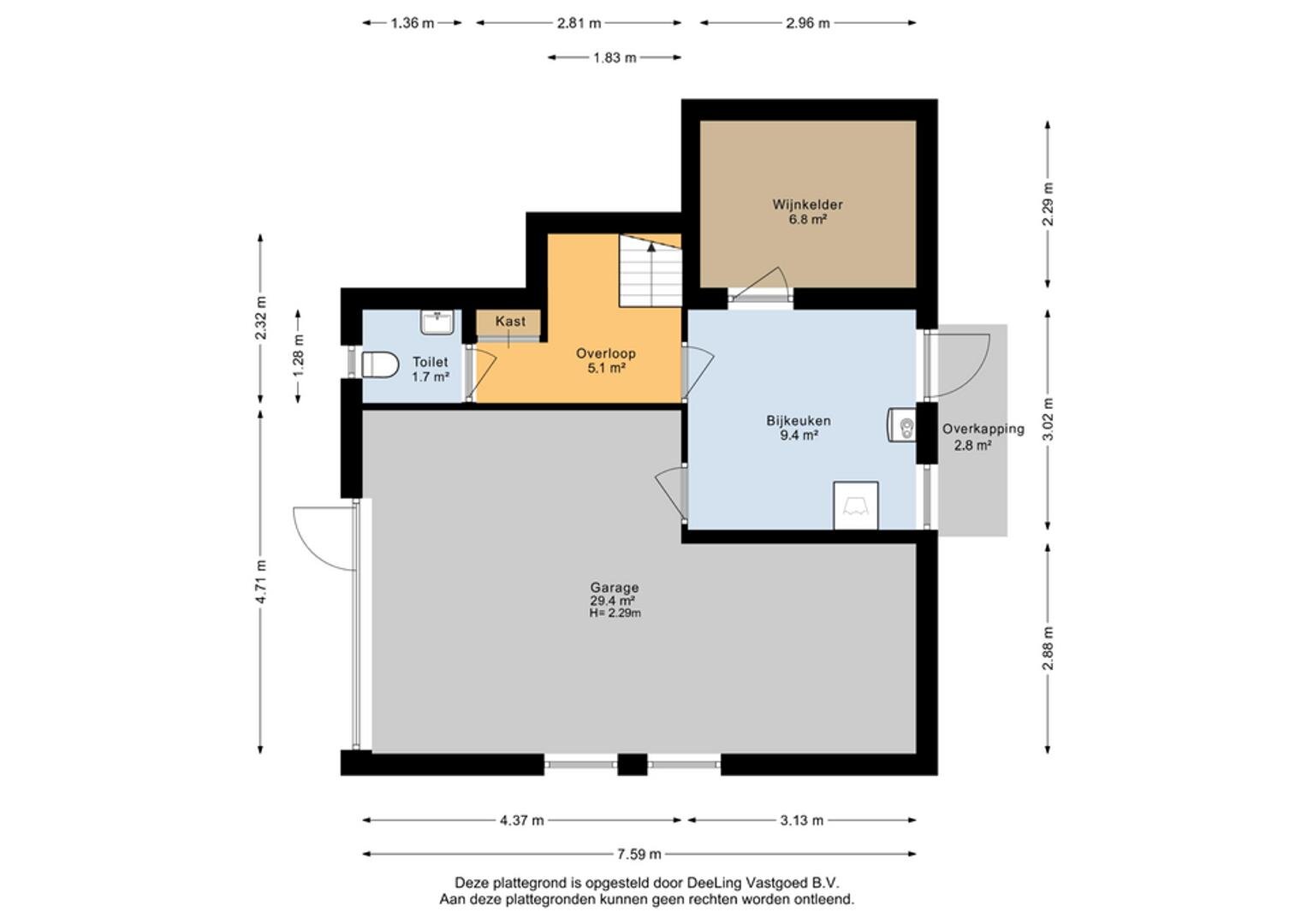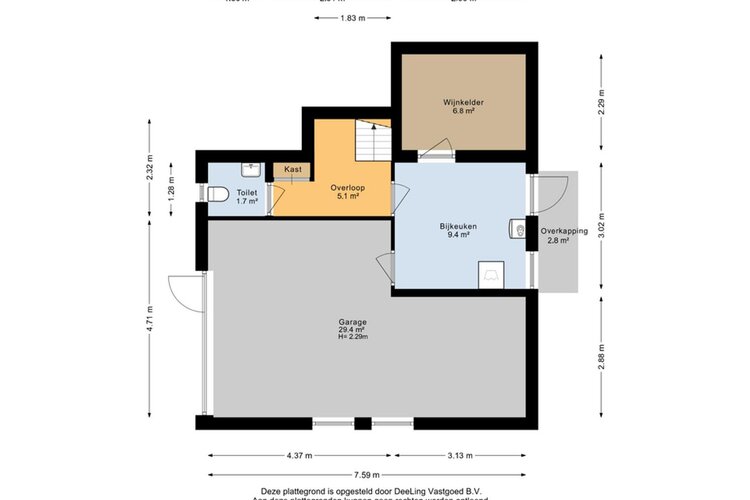 Het souterrain bereik je onder andere via de trap in de hal/entree, maar ook via de garage. In het souterrain tref je een praktische bijkeuken aan met de opstelling van de cv-ketel en ruimte voor de wasmachine en droger. Voor de wijnliefhebber is er, vanuit de bijkeuken bereikbaar, een afgesloten, koele wijnkelder, perfect om uw verzameling te bewaren. Verder bevindt zich hier een nette toiletruimte en de garderobe. Vanuit de bijkeuken bereik je de riante garage, die als 'drive-in' voor de auto of als volwaardige hobbyruimte te gebruiken is.