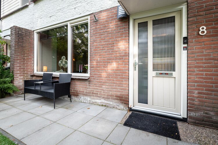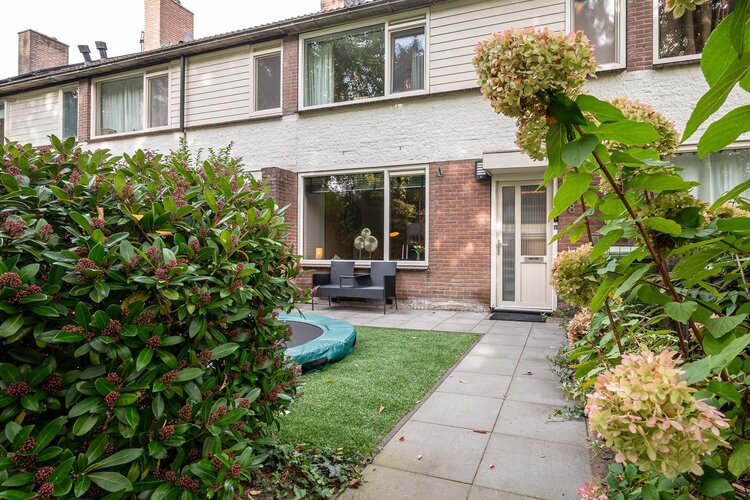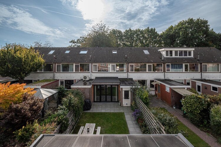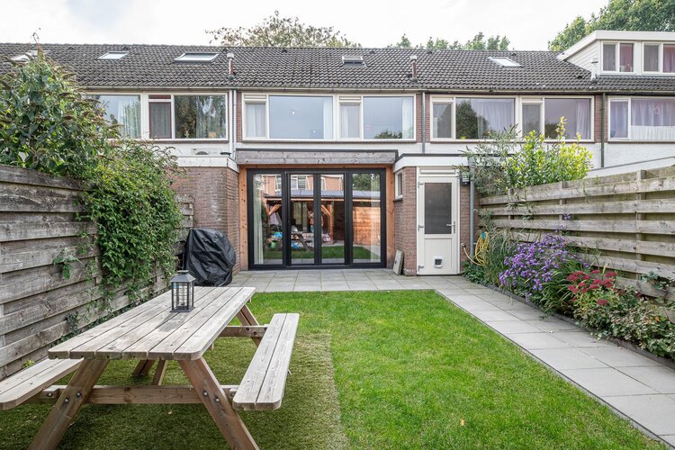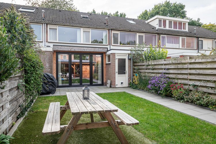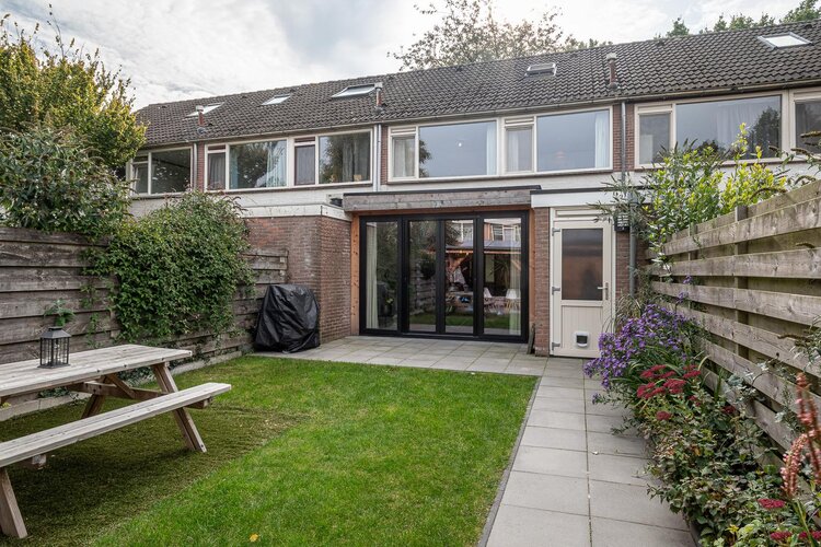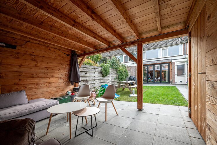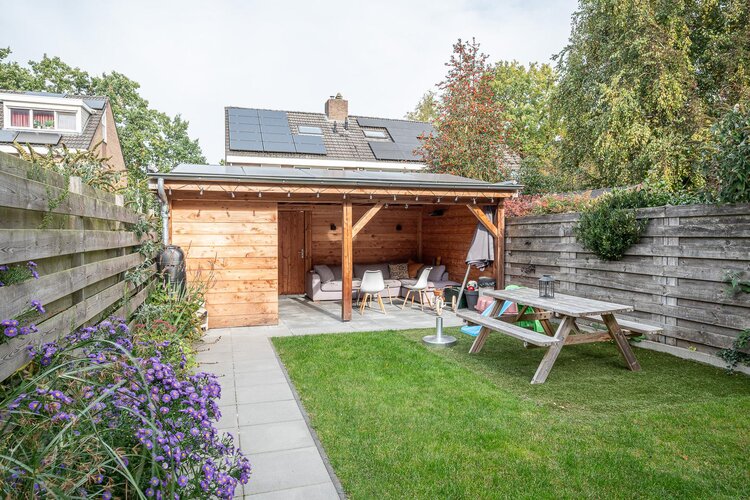 Via de dubbele schuifpui stap je zo de fraai aangelegde achtertuin in. De tuin ligt op het noordwesten, wat betekent dat je hier in de middag en avond volop van de zon kunt genieten. Onder de sfeervolle overkapping is het bovendien ook bij minder weer goed toeven. Achterin de tuin staat een praktische houten berging voor fietsen en tuingereedschap. Daarnaast is er een achterom, ideaal voor extra gemak en bereikbaarheid.